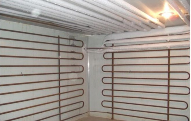 铝合金顶排管内壁光滑,管内流速大,正常运行时不易存集污物和油垢,传热效果好。铝合金排管可采用热氨融霜或热氟融霜,融霜效果好。